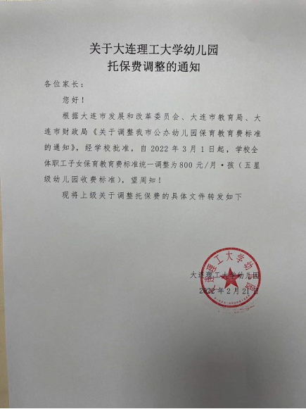 各公办幼儿园须严格执行收费公示制度,在园内场所显著位置设置固定公示板(牌、栏),公示收费项目、收费标准、收费依据、退费规定、监督投诉电话等事项,主动接受家长和社会的监督。本通知自2022年3月1日起执行。原《关于调整我市公办幼儿园保育教育费标准的通知》(大价发〔2014〕87号)同时废止。