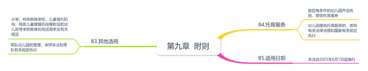健全规划举办机制,促进资源供给。包括资源配置、发展普惠、园所类型、布局规划、配套建设、村镇体系、特殊教育、设置条件、设立程序、变更撤销、党的建设、民主管理、举办限制、逐利限制等13条内容。