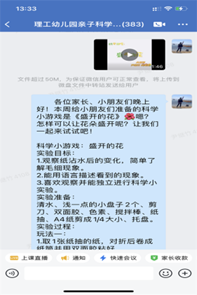 幼儿的科学教育是科学启蒙教育,其教育的核心在于保护与激发幼儿的好奇心和探索欲。幼儿的成长离不开家长及教师的陪伴,家长参与的亲子科学活动更具有培养意义和价值。因此,理工幼儿园于2018年建立亲子科学交流群,至今已近五年。这五年里,教师共分享科学实验108个,孩子独立讲解科学实验831次,教师专业评价1600余条,受益家庭近700个。每周二教师都会在群中分享一个精挑细选、亲自录制的科学游戏视频,并整理成文字,便于家长指导孩子积极参与游戏。
