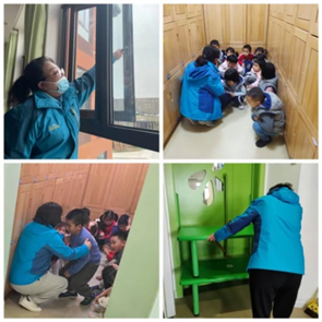 听到警报声后,大家迅速展开行动。在操场上做游戏的班级教师迅速带领幼儿安静、有序地撤离到教室。利用玩具柜、桌子等物品封堵教室正门,关闭门窗、拉好窗帘,带幼儿躲避在远离门窗的安全地带,筑起保护幼儿的第三道防线,防止“暴徒”闯入室内伤害他们。