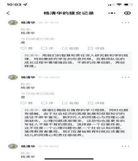 老师每读完当日内容后,在微信小程序中自觉打卡,同时书写读书笔记或在评论区书写小感悟。在周末,老师还有关于阅读其他书籍的感悟!