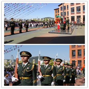 开幕式上,幼儿园特邀理工大学国旗护卫队的哥哥姐姐为孩子们展示别样风采。英姿飒爽、步履坚定、大步向前,交接——升旗——行注目礼,国歌嘹亮,五星红旗徐徐升起。