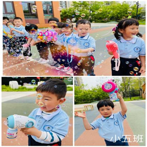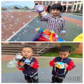 ……有的孩子怎么抓也抓不到泡泡,有的孩子一遍一遍耐心调试泡泡液,有的孩子追着泡泡跑呀跑。阳光打在泡泡上,五颜六色的,好看极了!