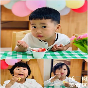 叮咚!听说美食区的水果捞大受孩子们的喜爱。今天小编早早就来到美食区。温馨的生活馆中,老师为孩子们准备了新鲜的水果和健康的食材,小朋友们秒变厨房小能手,看他们吃得香喷喷的样子,小编都觉得心里甜甜的!