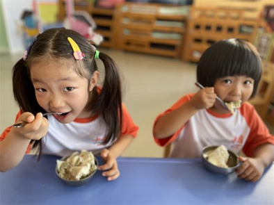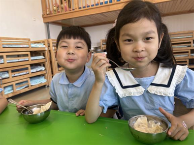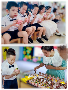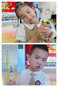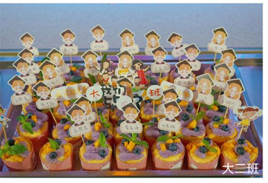 厨房的叔叔阿姨为小朋友们制作了美味的毕业蛋糕,每个蛋糕上都有小朋友自己的名字。甜甜的蛋糕蕴藏着老师的祝福,希望他们的未来像这蛋糕一样甜甜蜜蜜。