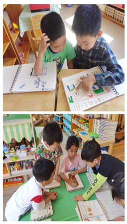 幼儿从第一次活动时,不理解什么是设计图,不懂得如何进行小组合作,只能完成最简单的桌椅造型搭建,到第二次活动学会观察生活中物品的细节,能根据自己的理解进行新的设计与制造,其观察力、创造力及动手操作能力有了明显的提升。在“虫虫轨道”设计图纸环节,幼儿学会了小组合作的最优工作方式。