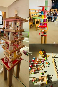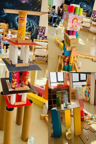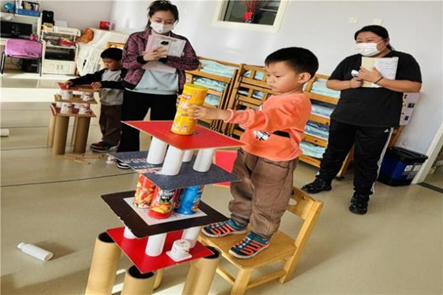 有的幼儿制作了口味、形状不同的蛋糕摩天大楼、有的幼儿建成了高高的停车场大楼、还有的幼儿建成了迷宫式的商场……游戏结束后,每一名幼儿都变成了“小小讲解员”,介绍作品的名称、使用材料以及用途。段老师总结了幼儿在游戏中的问题,引领他们及时总结经验并共同解决问题。