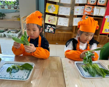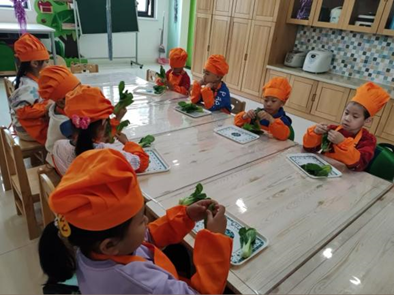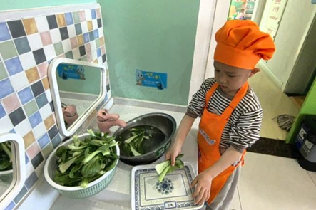 在生活馆里,孩子们穿上小围裙、戴上厨师帽和小套袖,个个精神抖擞,仿佛真的成了一位位小小厨师。他们认真看着手里的蔬菜,仔细检查是否有枯叶、虫咬的地方,用小手使劲地将油菜叶一片一片地掰下来。孩子们特别专注,灵巧的小手不一会儿,就择完了所有的菜。