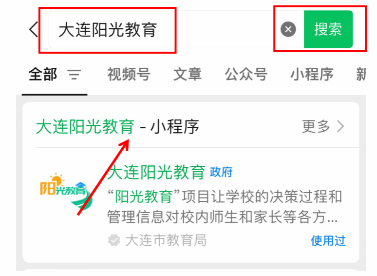 家长需打开微信“发现”—“搜一搜”搜索“大连阳光教育”点击进入平台小程序。在登录前,学校会将家长的手机号码录入系统,登录时系统会自动识别家长身份并跳转到学校的主页面。