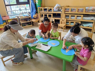 幼儿在家长的陪伴下,认真地做着手工。有做西瓜扇,有做火龙果扇子的,都是他们爱吃的水果形状。最后幼儿带着做好的小扇子来到户外给小草和小树扇扇风。