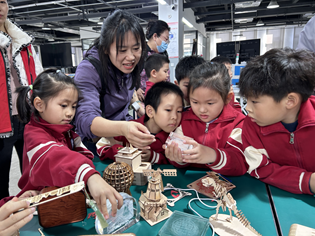 看到激光在剪纸和木板上创作出精美图案,他们纷纷围上去好奇打量,不断向工作人员提问:“为什么那个坑坑洼洼的地方是黑色的?”“我可以把这个书签拿回家么?”