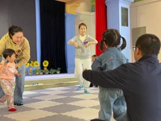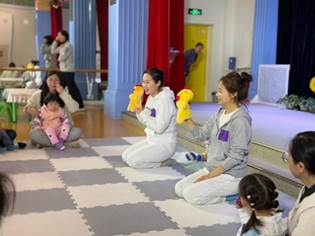 音乐响起,歌曲《快乐的黑母鸡》将现场气氛推向高潮。宝贝们手握沙响蛋,瞬间化身成一个个活力四射的小歌手和小舞者,沉浸在音乐带来的欢乐中,尽情享受着表演带来的快乐。
