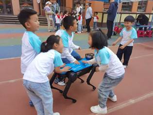 未来技术学院工会带来的机器狗同样令人惊叹。它熟练地做出各种踏步、行走等动作,还能在指令下完成转圈、趴下等“高难度”动作。小朋友们忍不住欢呼鼓掌,有的孩子还勇敢地伸手与机器狗互动,体验科技与生命的奇妙融合。