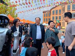 创新创业学院的机器人亮相,瞬间点燃全场。它不仅动作灵活,还能与孩子们进行亲密的肢体互动。缓缓伸出机械手掌与孩子们一一握手,听到指令后稳稳前进、后退。当机器人弯下“身躯”与孩子们击掌时,现场爆发出阵阵欢呼,科技的温度在指尖传递,孩子们沉浸式感受智能世界的奇妙。