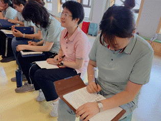 培训现场,大家认真聆听、仔细记录。会后部分家长与班级老师互动交流,共同商讨幼儿教养策略。