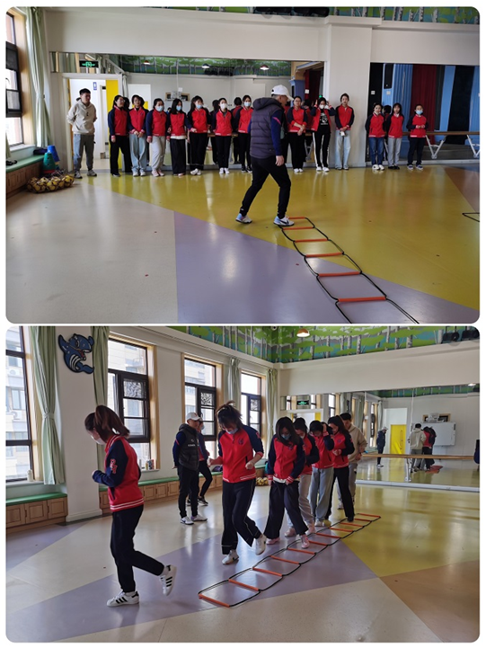 教练针对训练内容定期给教师进行培训,教授一些基本简单的动作,如双脚交替运球、传球、停球等动作技巧,让教师初步掌握足球基本技能。球场上的教师像孩子一样快乐练习、反复尝试……