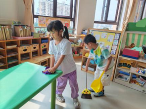 我们一起搬东西、擦椅子、整理玩具,布置“新家”。