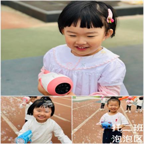 ……有的孩子怎么抓也抓不到泡泡,有的孩子一遍一遍耐心调试泡泡液,有的孩子追着泡泡跑呀跑。阳光打在泡泡上,五颜六色的,好看极了!