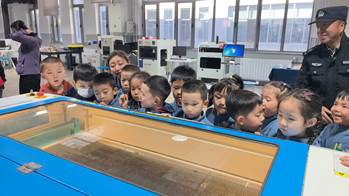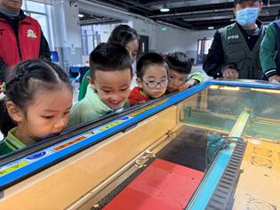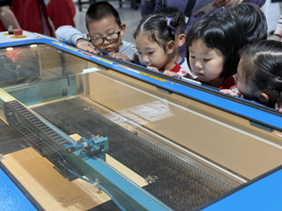 移步至激光加工区,高速运转的激光设备像科幻电影里的神秘武器,孩子们惊叹出声,目光紧追激光切割轨迹。