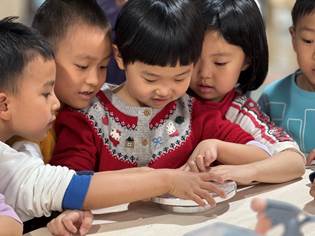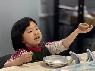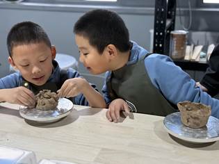 “我记得新年活动的时候老师说捏泥塑的时候要注意力度,这样做出来的杯子才不会变形。”大家都专注地将之前学到的技巧运用到陶瓷制作中,小小的脑袋里不断迸发出创意。