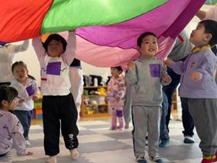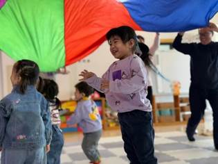 彩虹伞被老师高高举起,如同绽放的巨大花朵,释放出梦幻般的光芒。孩子们欢快地踩在色块之上蹦跳,依照指令化作灵动的小陀螺。拉圈搭起的帐篷下,爆发出阵阵欢声笑语,快乐似繁星点点,闪烁在这片童趣天地,轻柔地滋养着每一个孩子的成长。