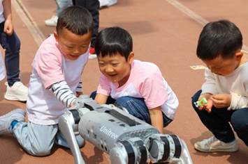 未来技术学院工会带来的机器狗同样令人惊叹。它熟练地做出各种踏步、行走等动作,还能在指令下完成转圈、趴下等“高难度”动作。小朋友们忍不住欢呼鼓掌,有的孩子还勇敢地伸手与机器狗互动,体验科技与生命的奇妙融合。