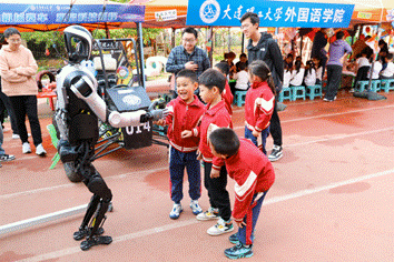 创新创业学院的机器人亮相,瞬间点燃全场。它不仅动作灵活,还能与孩子们进行亲密的肢体互动。缓缓伸出机械手掌与孩子们一一握手,听到指令后稳稳前进、后退。当机器人弯下“身躯”与孩子们击掌时,现场爆发出阵阵欢呼,科技的温度在指尖传递,孩子们沉浸式感受智能世界的奇妙。