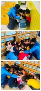 听到警报声后,大家迅速展开行动。在操场上做游戏的班级教师迅速带领幼儿安静、有序地撤离到教室。利用玩具柜、桌子等物品封堵教室正门,关闭门窗、拉好窗帘,带幼儿躲避在远离门窗的安全地带,筑起保护幼儿的第三道防线,防止“暴徒”闯入室内伤害他们。