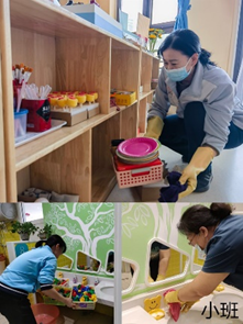 班级环境卫生的消毒更是不能马虎。看,保育老师都在细心清洁、消毒室内的各个角落,给孩子们一个干净、整洁、健康的生活游戏环境。