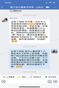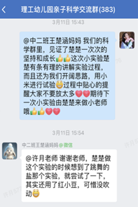 家长将孩子游戏过程的照片、视频及感悟分享在亲子科学交流群中。教师看到孩子的喜悦与收获,积极给予专业的评价指导。家园互动,共同体会着科学带来的快乐。