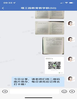 领读老师撰写并发布读书方案,每日早八点相约在教师群中,以拍照的形式上传10页阅读内容。